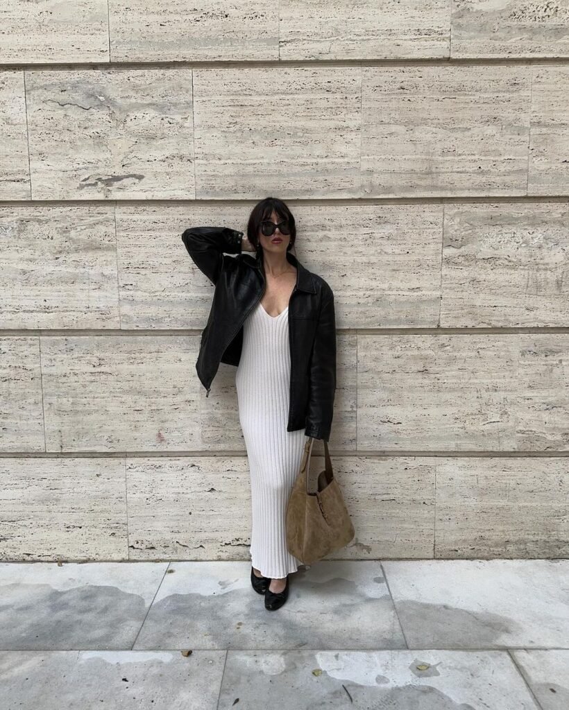 - Knitted Ribbed V-Neck Dress (Ophelia): A versatile midi dress with a flattering V-neck and ribbed texture, perfect for layering or standalone wear. Made from soft, breathable organic cotton, it offers timeless elegance while benefiting from EU production’s high standards, ensuring longevity and minimal environmental harm. View product.